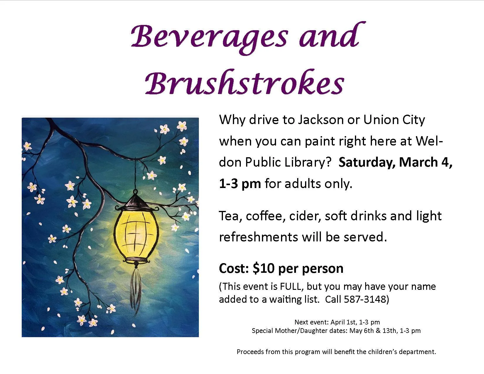 Why drive to Jackson or Union City when you can paint right here at C. E. Weldon Public Library? Tea, Coffee, Cider, soft drinks, and light refreshments will be served.