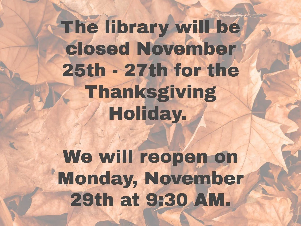 The library will be closed November 25th-27th for the Thanksgiving Holiday. We will reopen on Monday, November 29th at 9:30 AM.