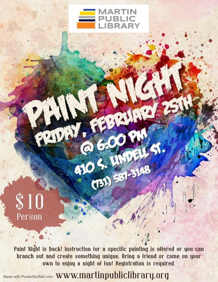 Paint Night is back!! Instruction will be offered for a specific painting or you can branch out and create something unique on an 11”x17” sized canvas. There is a small fee of $10 per person. Registration is required.