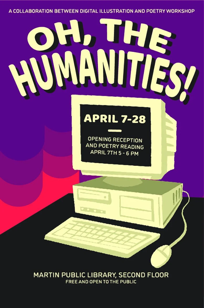 Opening reception and poetry reading for Oh, the Humanities!, a collaboration between digital illustration and poetry workshop.