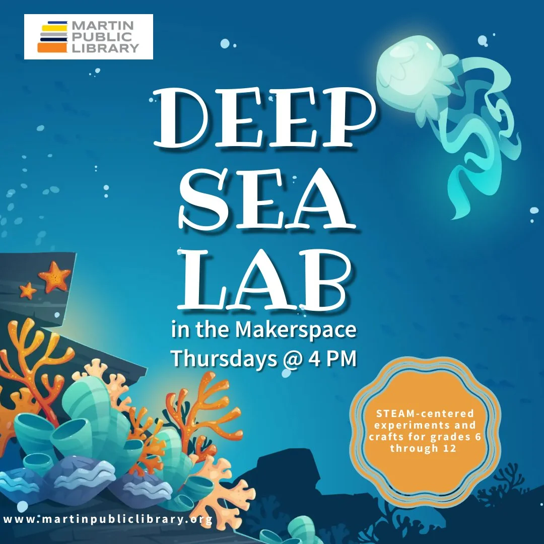 Deep Sea Lab Thursday, June 30, 2022 4:00 PM 5:00 PM 16:00 17:00 Martin Public Library 410 South Main Street Martin, TN 38237 (map) Google Calendar ICS STEAM-centered experiments and crafts for grades 6-12.