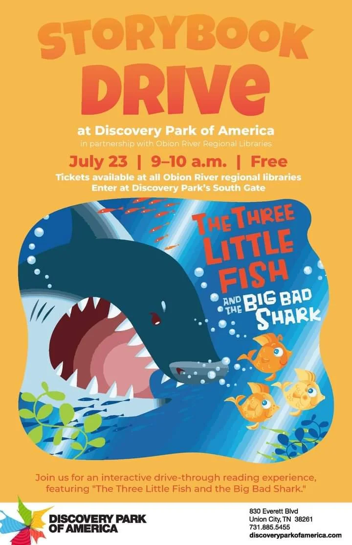 We are once again partnering with Discovery Park of America and the rest of the Obion River Regional Libraries to offer Storybook Drive! Present an invitation, which can be printed out or picked up at the library, at the south gate of DPA for FREE entry to the special event. Park passes for the end of the day will be given at the event exit.