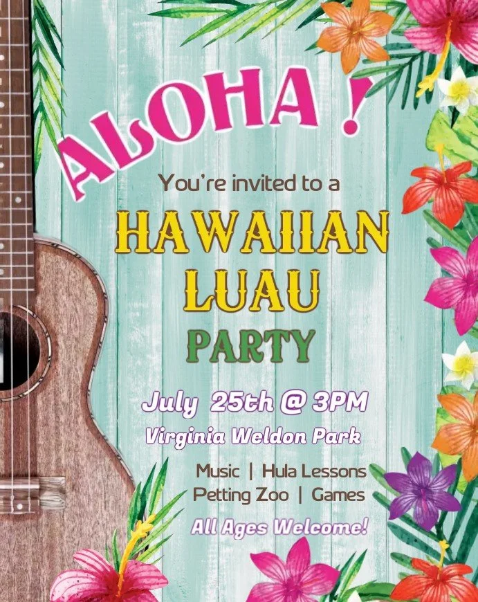 You’re invited to a Hawaiian Luau at Virginia Weldon Park! Join us for Music, Hula Lessons, Games, and a Petting Zoo!