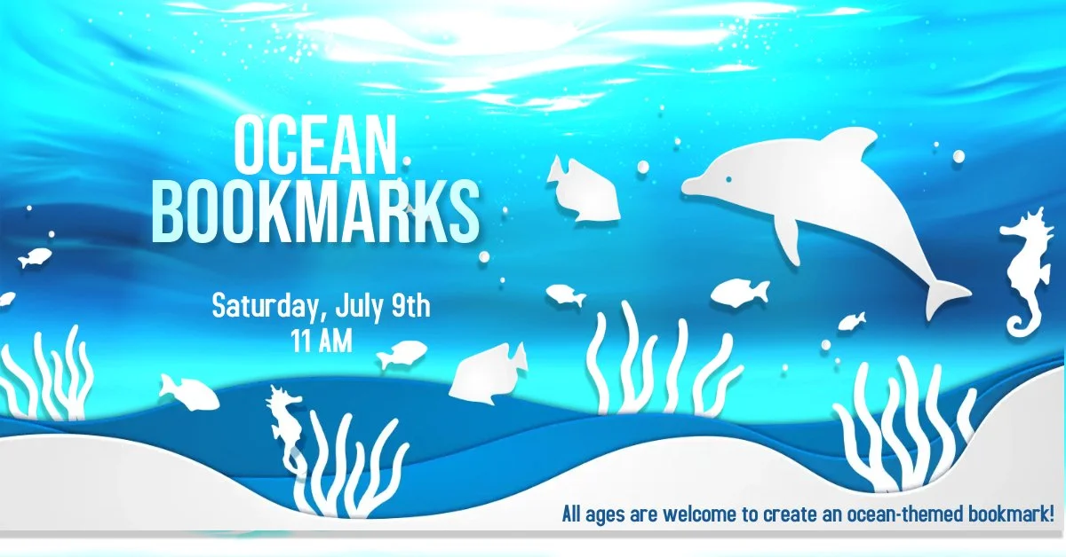 Ocean Bookmarks Saturday, July 9, 2022 11:00 AM 12:00 PM 11:00 12:00 Martin Public Library 410 South Main Street Martin, TN 38237 (map) Google Calendar ICS All ages are welcome to come create an ocean-themed bookmark!