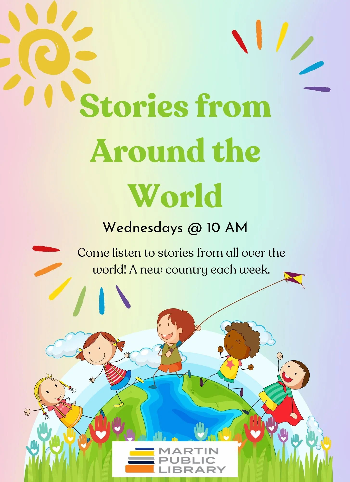 Stories from Around the World Wednesday, July 12, 2023 10:00 AM 11:00 AM 10:00 11:00 Martin Public Library 410 South Main Street Martin, TN 38237 (map) Google Calendar ICS Come listen to stories from all over the world! A new country will be featured each week.