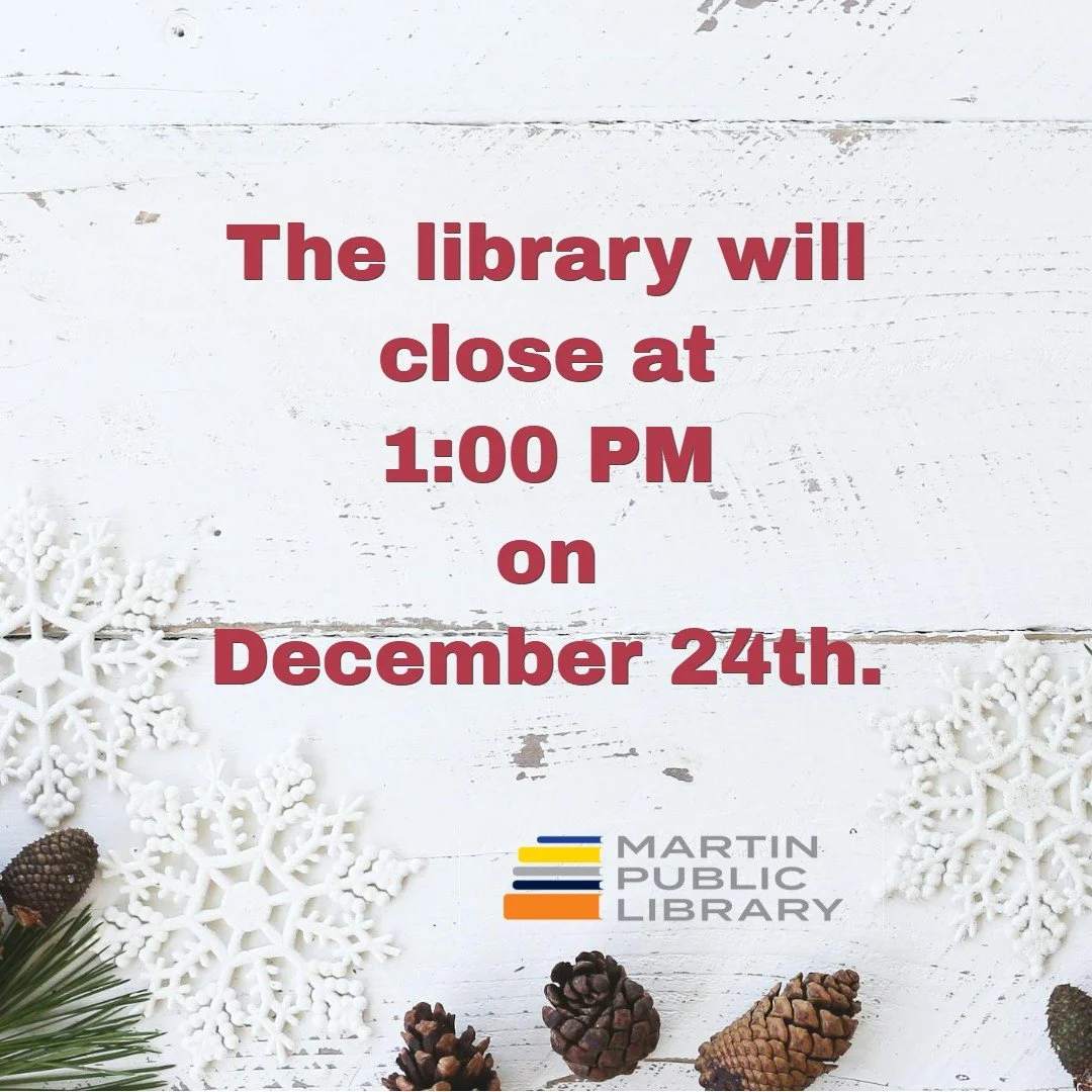 The library will close at 1:00 PM on December 24th, Christmas Eve. We will reopen on Friday, December 27th at 9:00 AM.