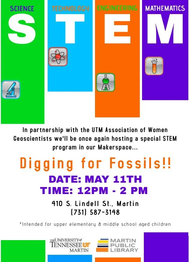 Digging for Fossils! Saturday, May 11, 2024 12:00 PM 2:00 PM 12:00 14:00 Martin Public Library 410 South Main Street Martin, TN 38237 (map) Google Calendar ICS Come dig for actual fossils with the Association of Women Geoscientists!