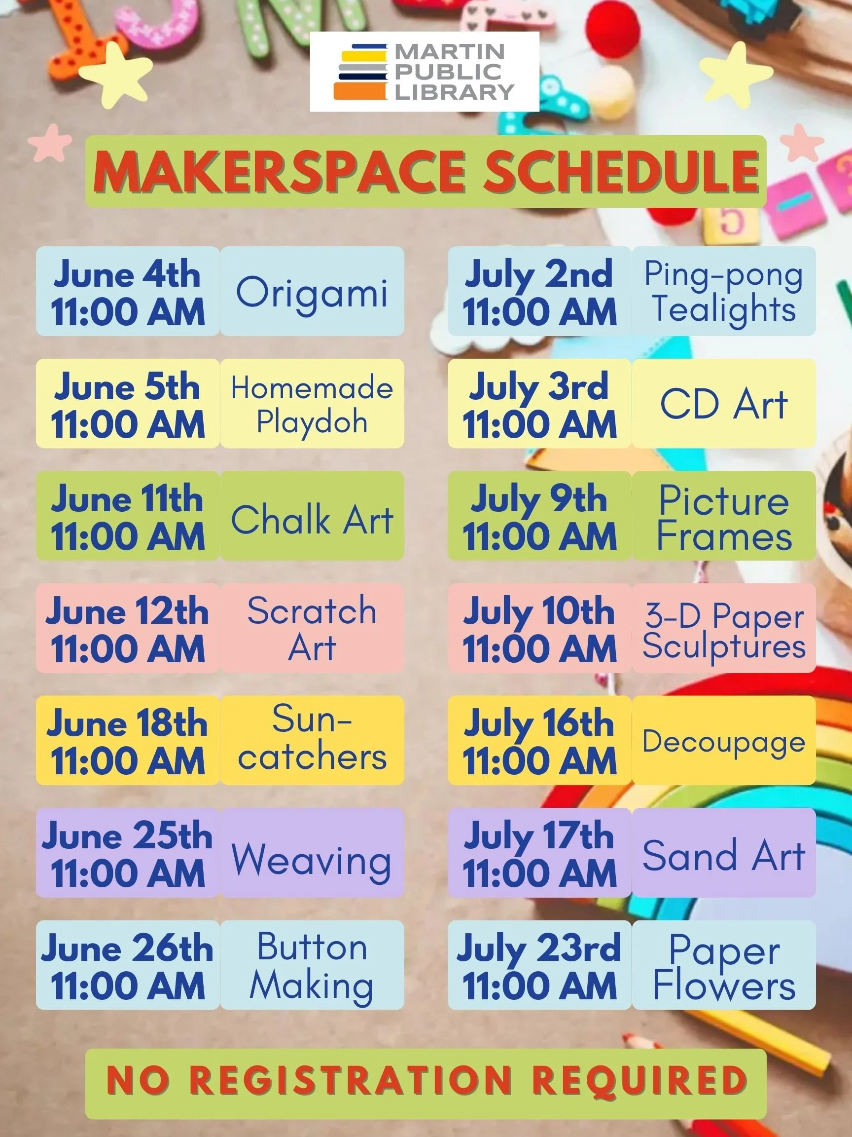 Chalk Art in the Makerspace Wednesday, June 11, 2025 11:00 AM 12:00 PM 11:00 12:00 Martin Public Library 410 South Main Street Martin, TN 38237 (map) Google Calendar ICS Wednesdays and Thursdays we will be focusing on a specific craft/activity in the Makerspace.