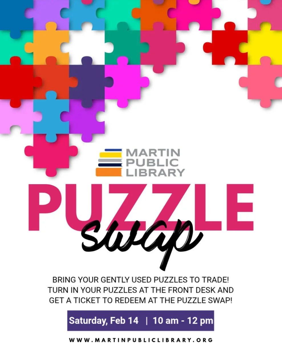 Puzzle Swap! Saturday, February 14, 2026 10:00 AM 12:00 PM 10:00 12:00 Martin Public Library 410 South Main Street Martin, TN 38237 (map) Google Calendar ICS Bring in your gently used puzzles and swap them for something new-to-you! All puzzle sizes welcome!