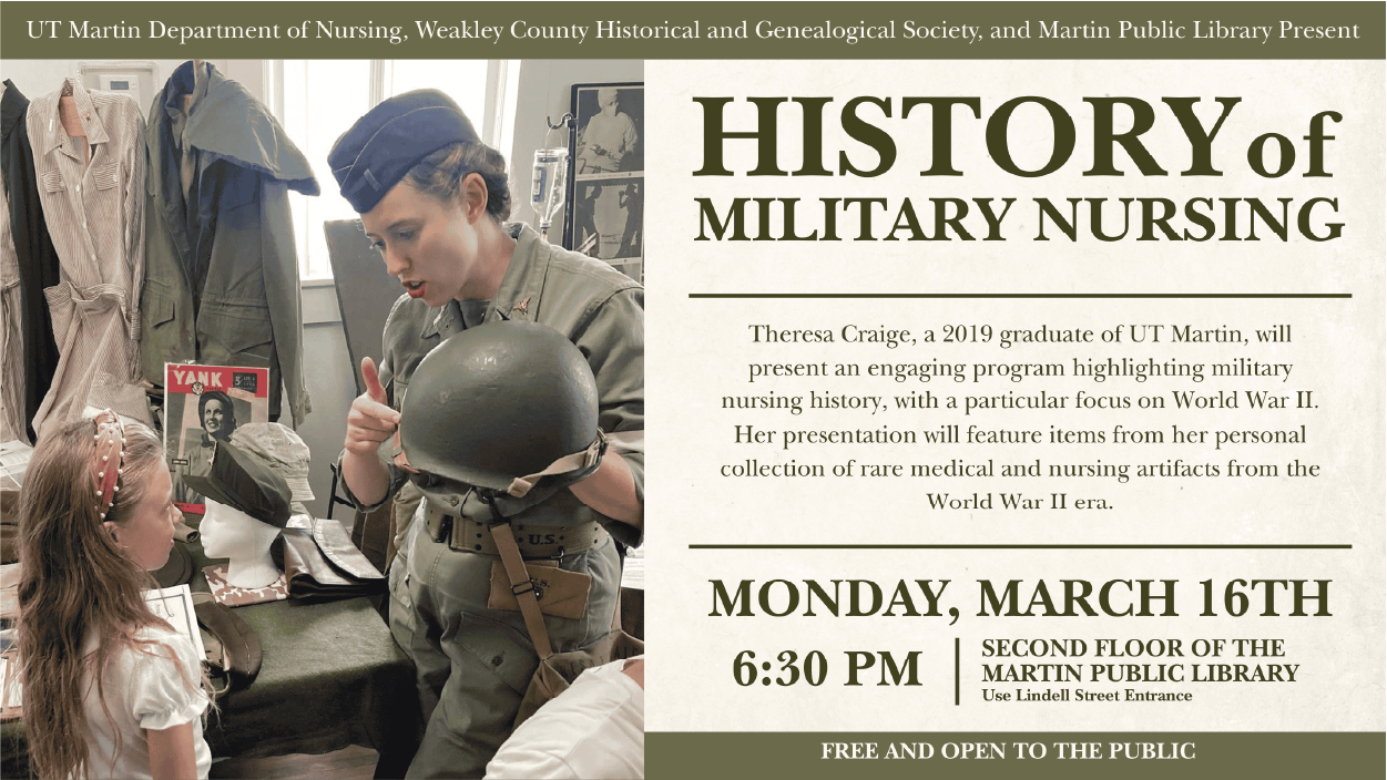 UT Martin Department of Nursing, WCHGS, and Martin Public Library present: History of Military Nursing.
